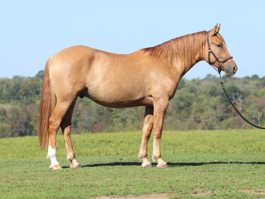 At 2 years of age, the horses are put under saddle and trained in both English and Western tack. They learn to respond to light cues, including leg pressure and seat position, and collect at walk, trot and canter.